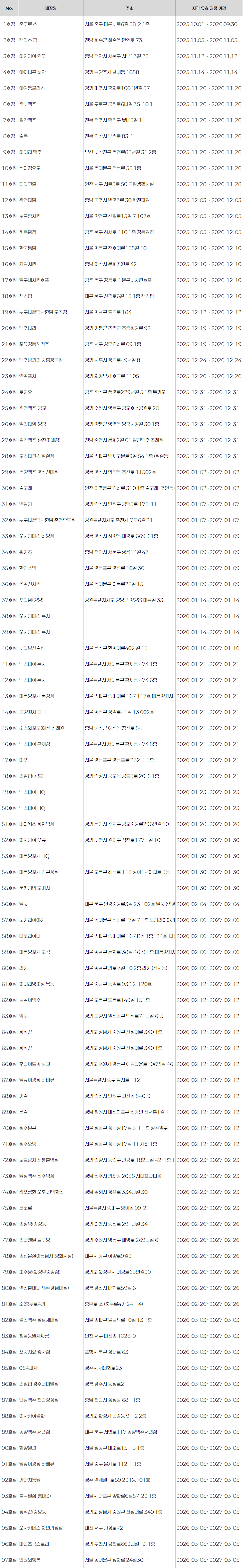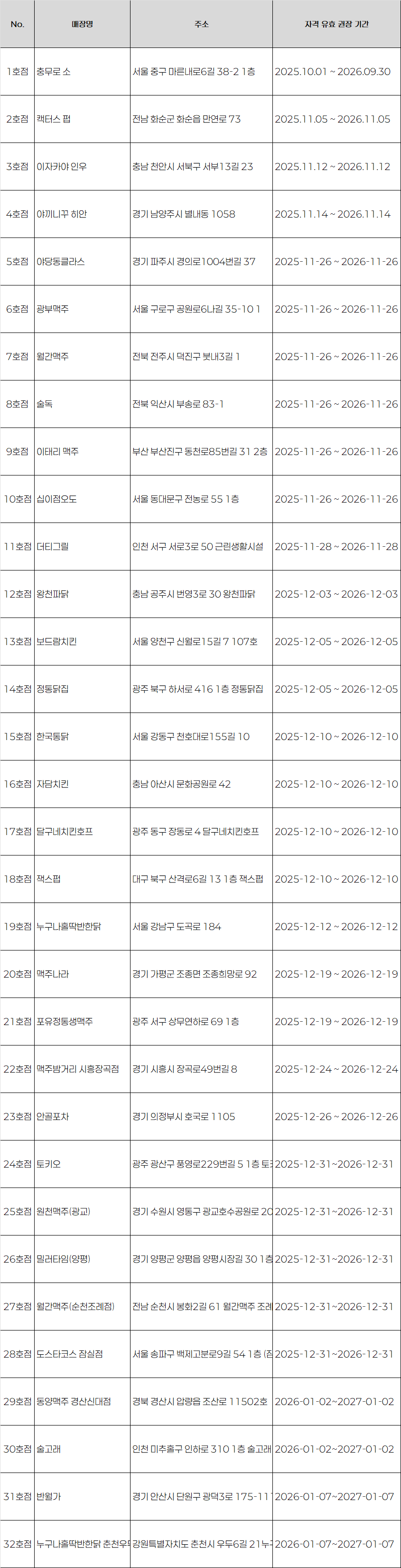 본 자격 검정 위원회에서 추천하는 아래 매장은 대한민국에서 차별화된 생맥주의 맛을 표현해내는 대표 업장입니다.
